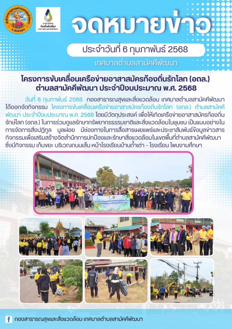 รายละเอียด : กองสาธารณสุขและสิ่งแวดล้อม เทศบาลตำบลสามัคคีพัฒนา ได้ดำเนินการจัดกิจกรรมโครงการขับเคลื่อนเครือข่ายอาสาสมัครท้องถิ่นรักษ์โลก (อถล.) ตำบลสามัคคีพัฒนา ประจำปีงบประมาณ พ.ศ.2568 ขึ้น ซึ่งมีกิจกรรมเก็บขยะบริเวณถนนเส้น หน้าโรงเรียนบ้านถ้ำเต่า – โรงเรียนโพนงามศึกษา ในวันที่ 6 กุมภาพันธ์ 2568 เวลา 09.30 น.