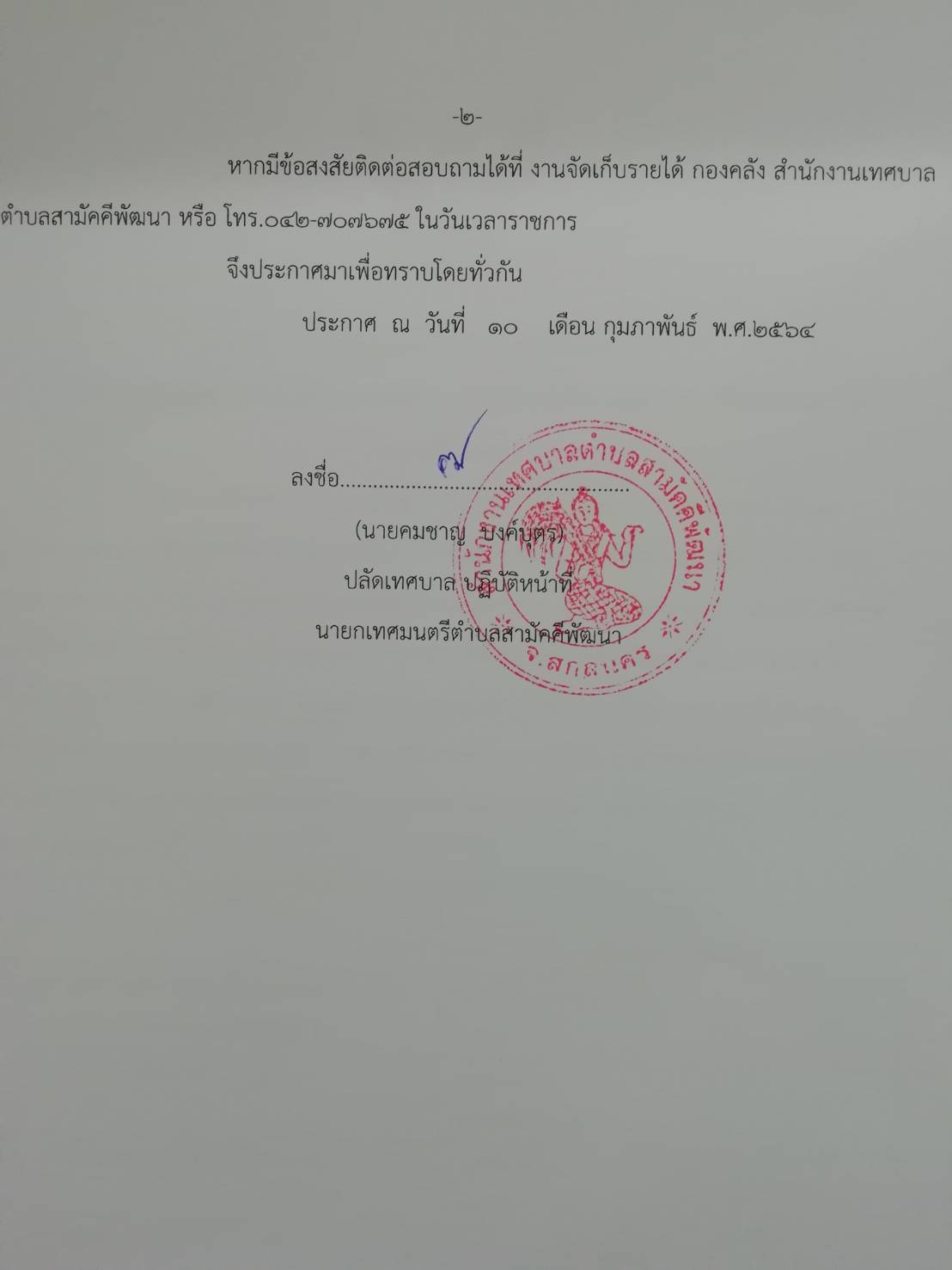 ประกาศเทศบาลตำบลสามัคคีพัฒนา เรื่อง การกำหนดเวลาดำเนินการตามพระราชบัญญัติภาษีที่ดินและสิ่งปลูกสร้าง พ.ศ. 2562 ประจำปี 2564