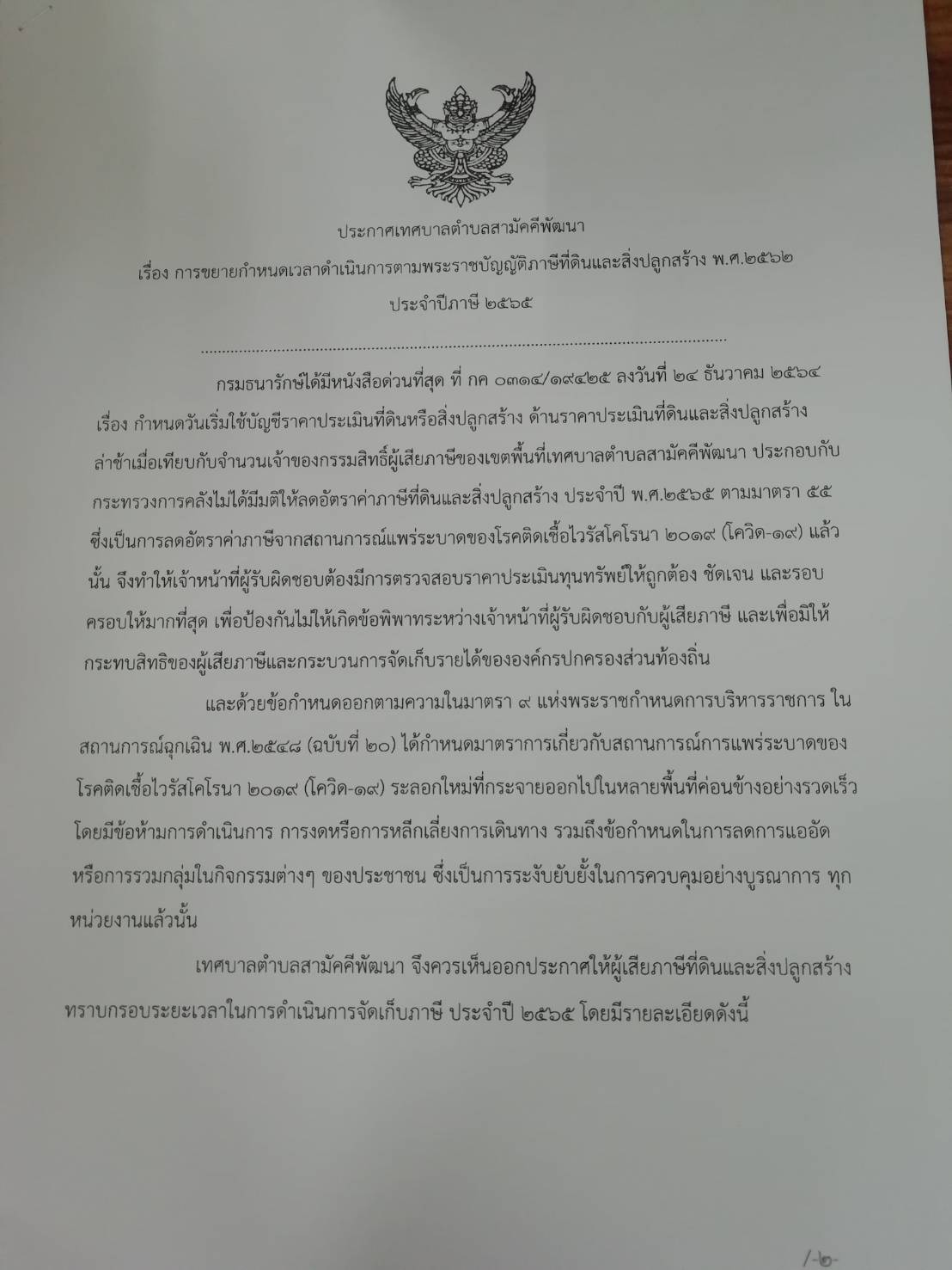 ประกาศเทศบาลตำบลสามัคคีพัฒนา เรื่อง การขยายกำหนดเวลาดำเนินการตามพระราชบัญญัติภาษีที่ดินและสิ่งปลูกสร้าง พ.ศ.2562 ประจำปีภาษี 2565