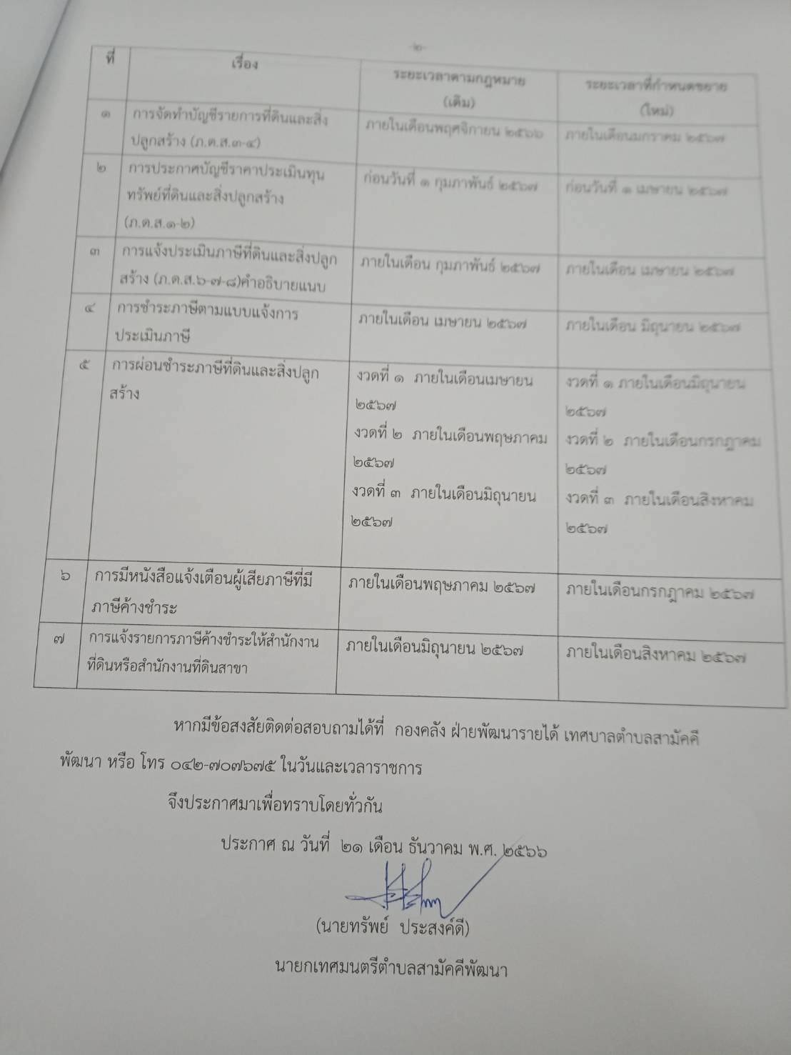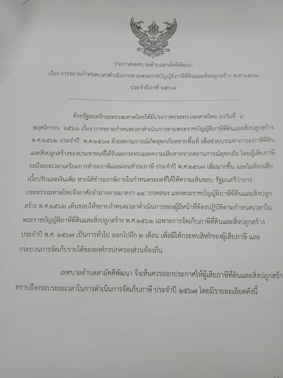 ชื่อเรื่อง : ประกาศ เรื่อง การขยายกำหนดเวลาดำเนินการตามพระราชบัญญัติภาษีที่ดินและสิ่งปลูกสร้าง พ.ศ.2562 ประจำปี ภาษี 2567