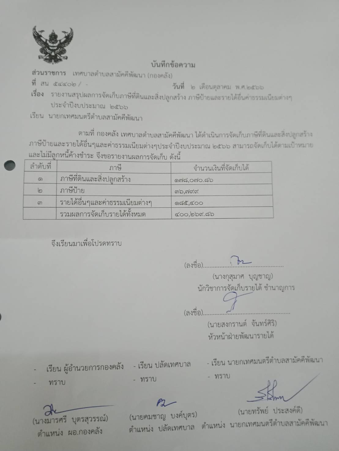 รายงานสรุปผลการจัดเก็บภาษีที่ดินและสิ่งปลูกสร้าง ภาษีป้าย และค่าธรรมเนียมต่างๆ ประจำปีงบ 66