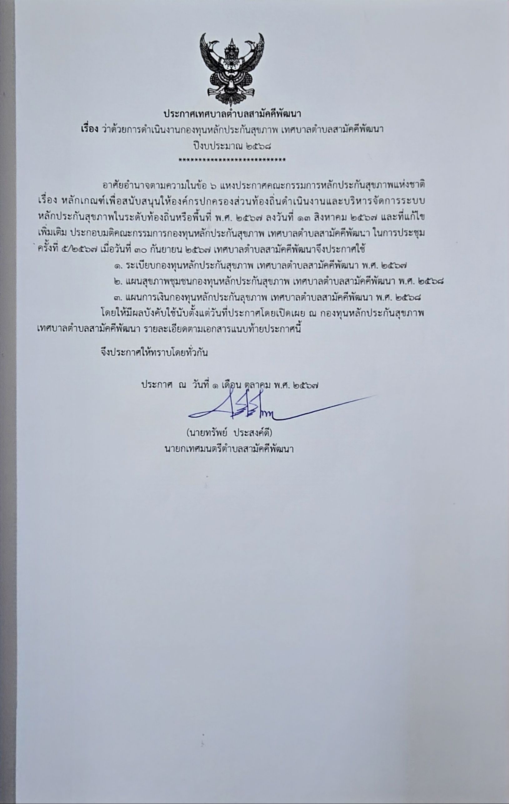 คณะกรรมการกองทุนหลักประกันสุขภาพ เทศบาลตำบลสามัคคีพัฒนา ได้อนุมัติระเบียบกองุทนและแผนการเงินปีงบประมาณ 2568 ตามมติคณะกรรมการกองทุน ในการประชุมครั้งที่ 5/2567 เมื่อวันที่ 30 กันยายน 2567