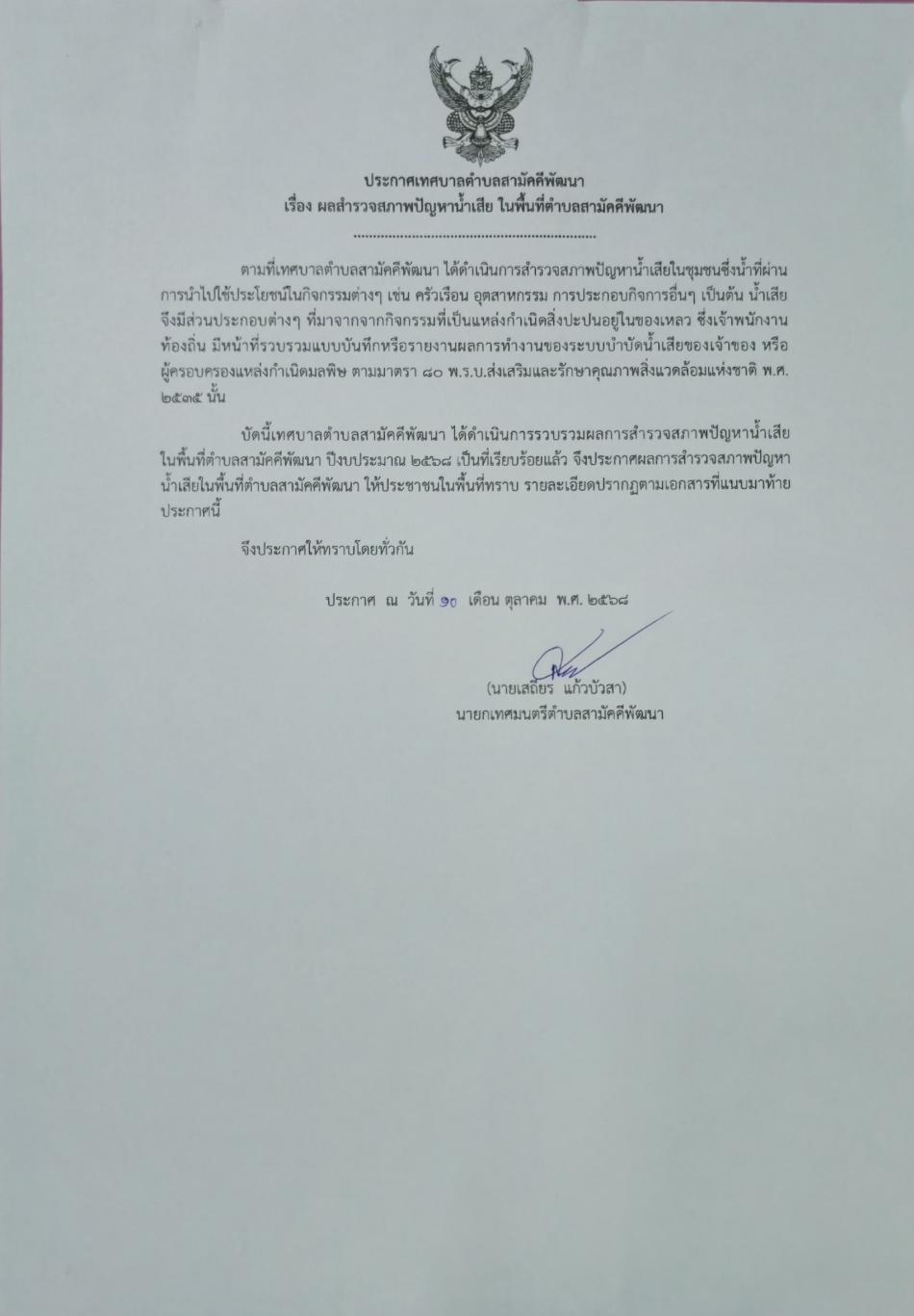 ประกาศเทศบาลตำบลสามัคคีพัฒนา เรื่อง ผลการสำรวจสภาพปัญหาน้ำเสีย ในพื้นที่ตำบลสามัคคีพัฒนา