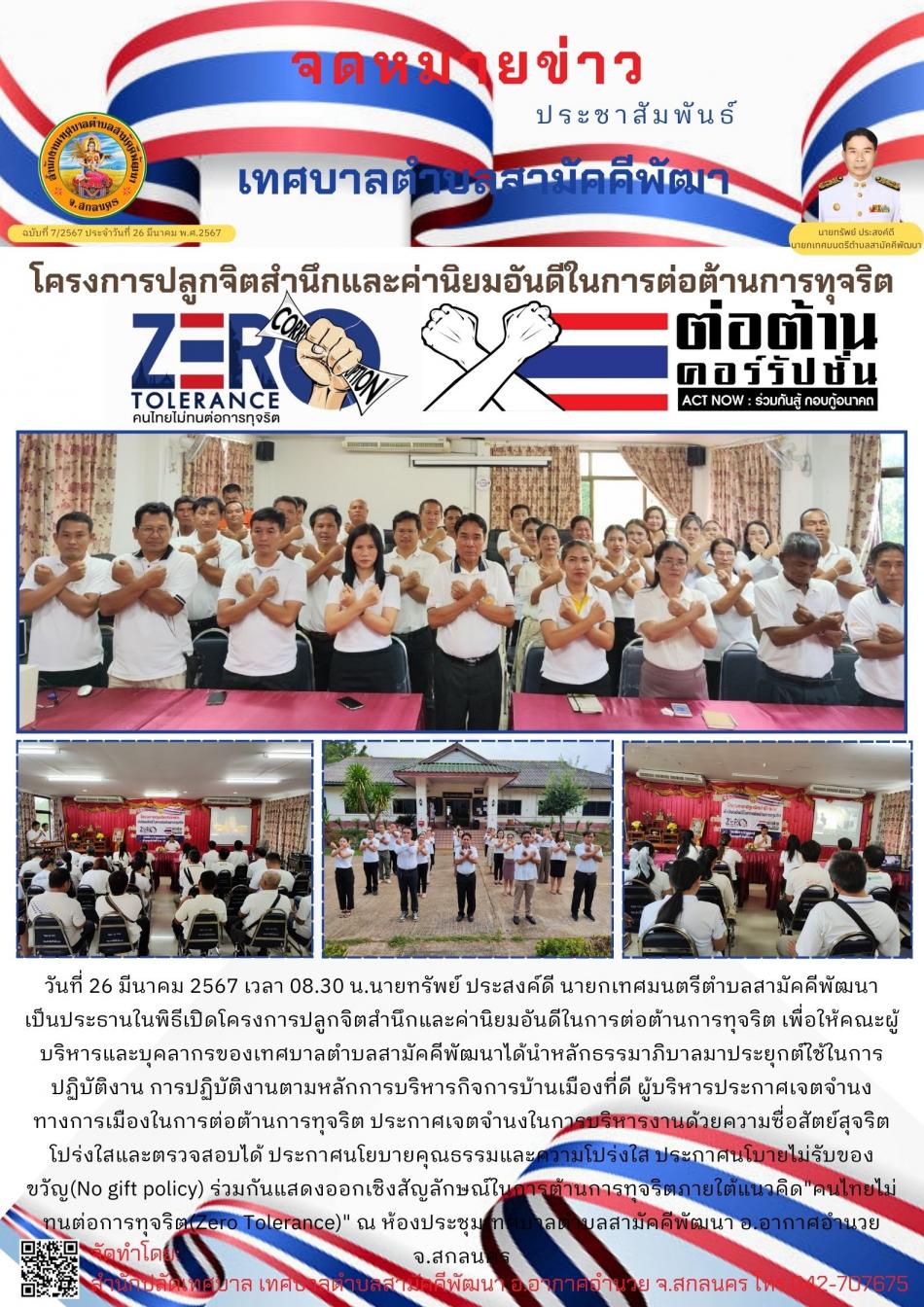 เทศบาลตำบลสามัคคีพัฒนาจัดโครงการปลูกจิตสำนึกและค่านิยมอันดีในการต่อต้านการทุจริต ประจำปีงบประมาณ 2567 [28 มีนาคม 2567]