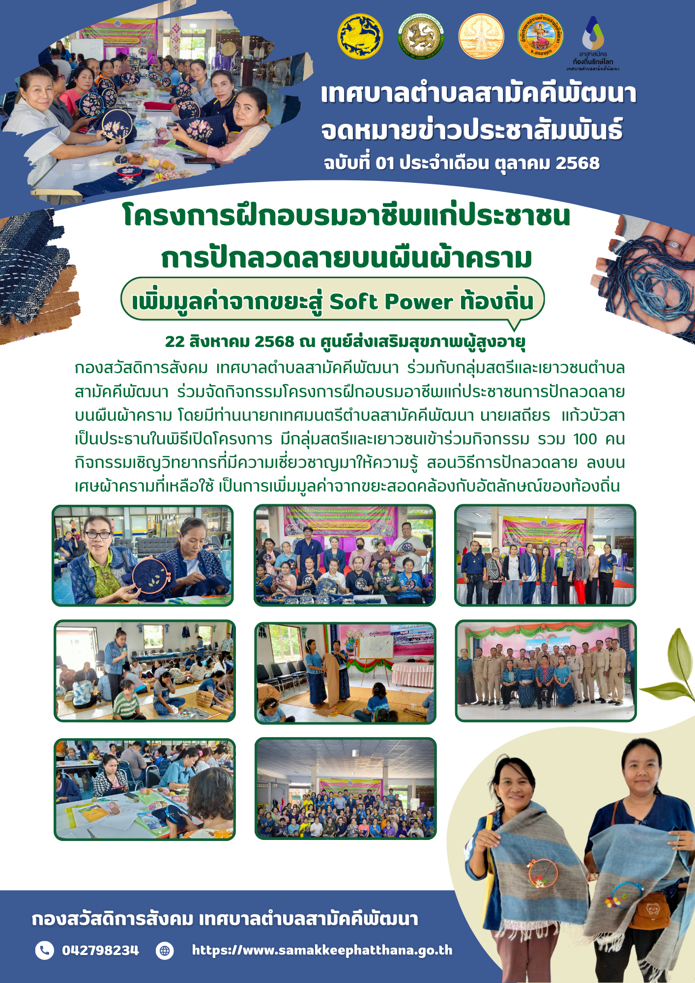 รายละเอียด : วันที่ 22 ต.ค. 68 ณ ศูนย์พัฒนาคุณภาพชีวิตผู้สูงอายุ กองสวัสดิการสังคม เทศบาลตำบลสามัคคีพัฒนา ร่วมกับกลุ่มสตรีและเยาวชนตำบลสามัคคีพัฒนา ร่วมจัดกิจกรรมโครงการฝึกอบรมอาชีพแก่ประชาชนการปักลวดลายบนผืนผ้าคราม โดยมีท่านนายกเทศมนตรีตำบลสามัคคีพัฒนา นายเสถียร แก้วบัวสา เป็นประธานในพิธีเปิดโครงการ มีกลุ่มสตรีและเยาวชนเข้าร่วมกิจกรรม รวม 100 คน กิจกรรมเชิญวิทยากรที่มีความเชี่ยวชาญมาให้ความรู้ สอนวิธีการปักลวดลาย ลงบนเศษผ้าครามที่เหลือใช้ เป็นการเพิ่มมูลค่าจากขยะสอดคล้องกับอัตลักษณ์ของท้องถิ่น